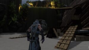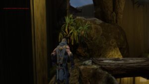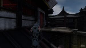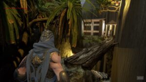 The player enters a dilapidated temple courtyard, surrounded by overgrown ruins and remnants of a forgotten siege. The main temple doors are sealed shut, but a beam of light shining from a nearby rooftop draws the player’s attention to an alternate path. Environmental clues and vertical design elements guide exploration as the player searches for a way inside.