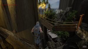 After scaling the cliff, the player follows a narrow forest path winding along the cliffside, where a broken bridge forces them deeper into the jungle. Along the way, they glimpse the ancient temple in the distance, creating anticipation and a clear goal. Navigating a fallen log bridge and crossing a ruined battlefield, the player finally reaches the temple courtyard, with its towering structure looming above as a powerful visual landmark.