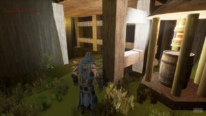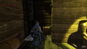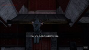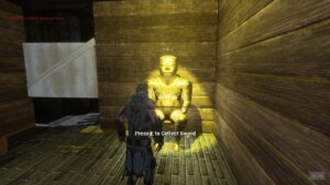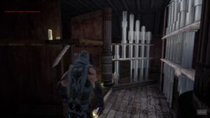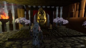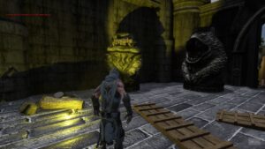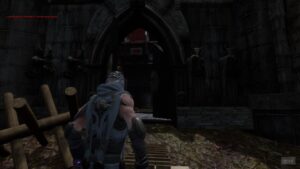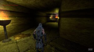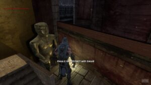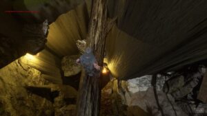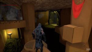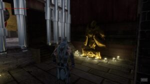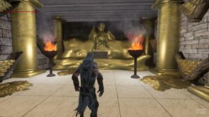 After scaling the temple and finding an alternate entrance, the player drops into a decayed throne room filled with signs of past looters and decay. They must solve a simple environmental puzzle by placing a sword onto a statue, triggering a hidden passage. Guided by candles, the player climbs through the rafters and descends a narrow stairwell deeper into the temple’s forgotten depths.