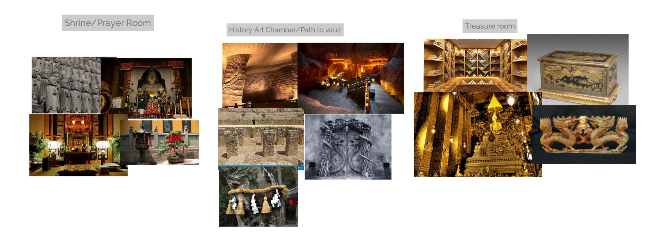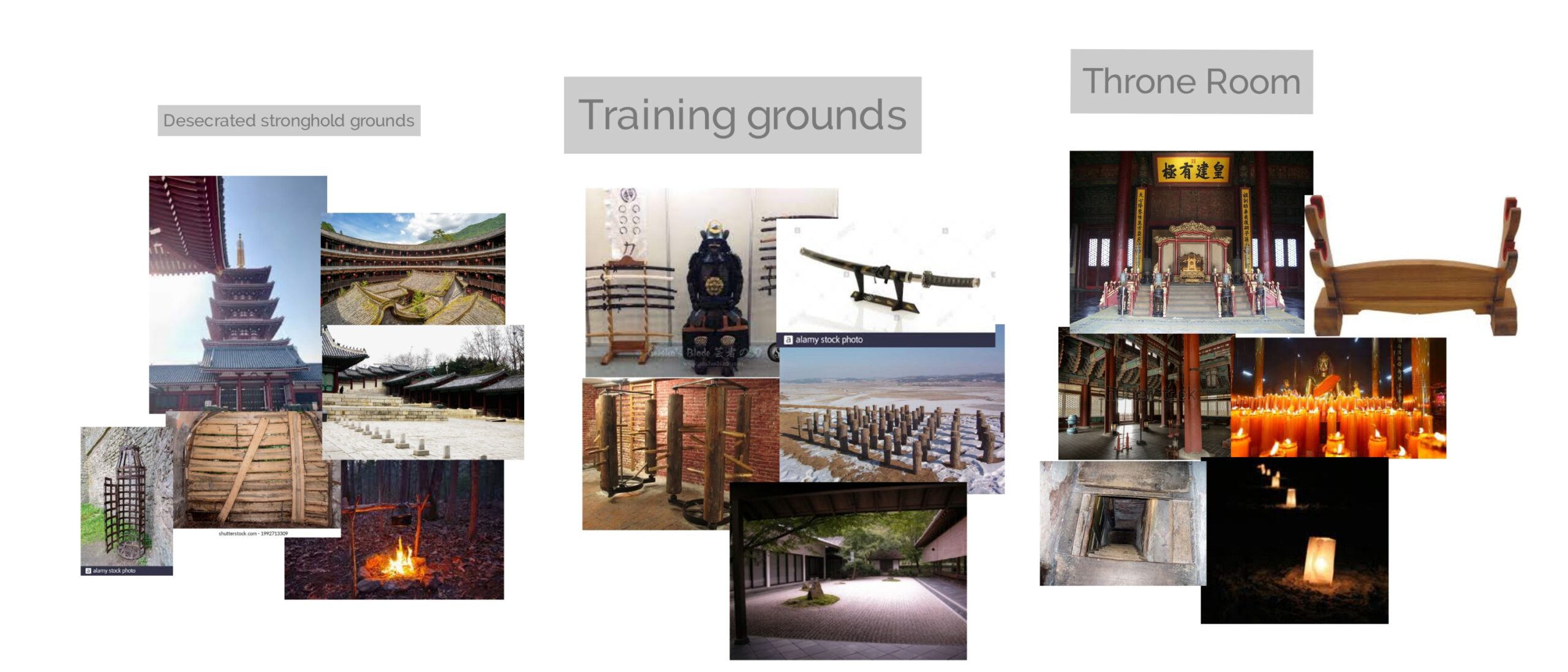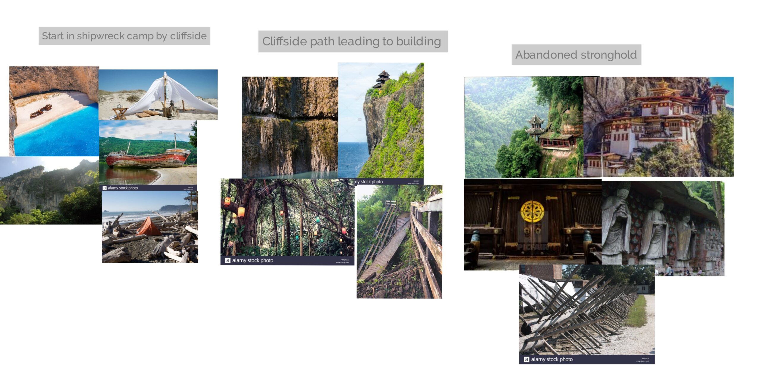 - Researching Real-World References: I drew inspiration from natural landscapes, coastal shipwrecks, ancient temples, courtyards, training grounds, treasure rooms, & more. These references helped me shape authentic environments that blended organic traversal with architectural focal points, reinforcing the theme of a forgotten island once inhabited and later reclaimed by time.